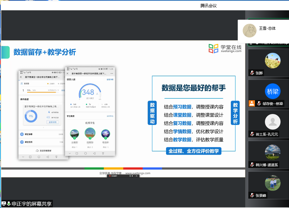 学堂在线申正宇解读了基于雨课堂5.2的教学新范式,详细介绍了雨课堂和腾讯会议平台融合的互补优势,并就师生实时在线互动、数据留存与教学分析等与参会教师开展了深入交流和讨论。