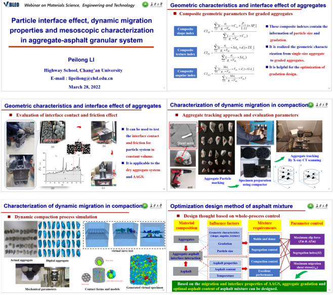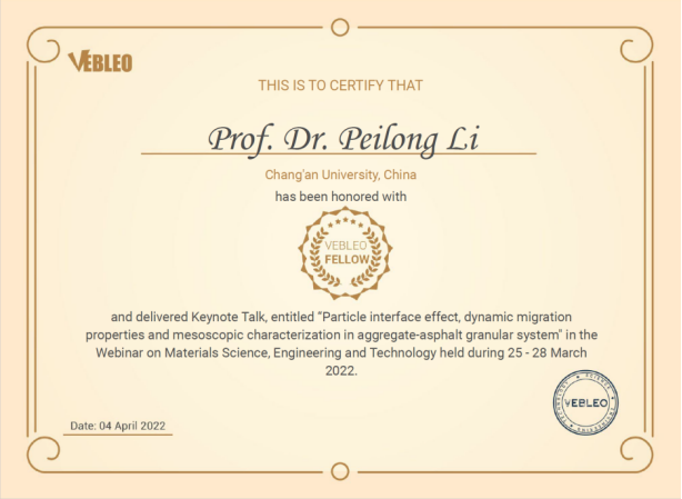 近日,买球体育栗培龙教授被授予国际科学组织Vebleo协会会士(Vebleo Fellow),并受邀在Vebleo主办的科学、工程与技术网络研讨会(Webinar onMaterialsScience, Engineering and Technology)中做了主题为“Particle interface effect, dynamic migration properties and mesoscopic characterization in aggregate-asphalt granular system”的主旨报告(Keynote Talk)。栗培龙教授介绍了他和团队在沥青混合料微细观作用行为与机理、表征方法及工程控制方面做出的学术贡献,特别介绍了近年来基于矿料-沥青颗粒体系动态迁移的沥青混合料设计-生产-施工-服役全过程量化表征与控制系列成果。