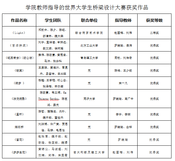 2022年6月26日,“中交公规院杯”2022世界大学生桥梁设计大赛总决赛顺利举行。买球体育桥梁工程系赵国辉副教授指导的作品《Light》获得二等奖,赵国辉获“优秀指导教师奖”,桥梁工程系罗晓瑜、陈峰、宋一凡等教师指导的5项作品获优秀奖、3项作品获入围奖。