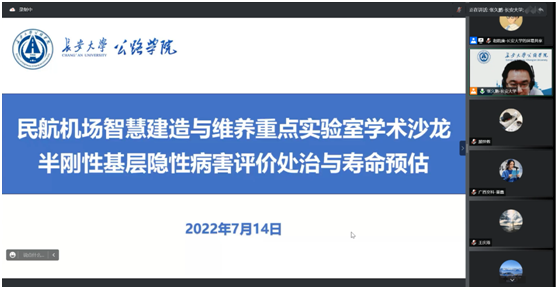 2022年7月14日下午,民航机场智能建造与维养重点实验室成功举办“半刚性基层隐性病害评价处治与寿命预估”线上学术沙龙。西北民航机场建设集团杨凯、圭目机器人有限公司钟新然、广西交通科学研究院王浩、买球体育官方网站杨旭、陕西高速机械化工程有限公司成高立等专家学者受邀做主题发言,东南大学、同济大学、买球体育官方网站、咸阳机场、福州机场等单位研究人员和技术骨干210余人参加了学术沙龙,学院副院长、民航重点实验室副主任张久鹏教授主持学术沙龙。