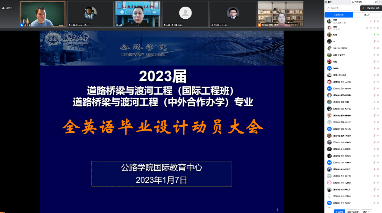 2023年1月7日上午9:00,买球体育国际教育中心面向道路桥梁与渡河工程(国际工程班)及道路桥梁与渡河工程(中外合作办学)专业召开了2023届全英文毕业设计(论文)动员会。双语教学团队50余名指导教师及200余名学生参会。会议由国际教育中心副主任李鹏主持。
