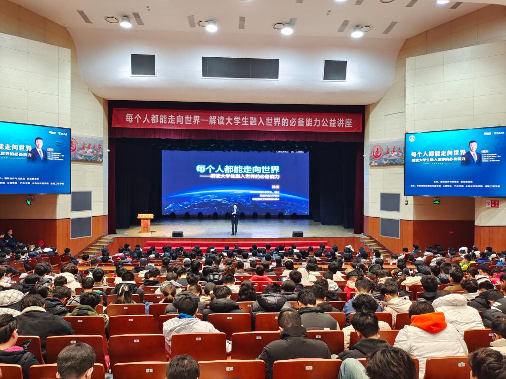 12月13日晚新东方教育科技集团助理副总裁、新东方前途出国总裁孙涛受邀来校作“每个人都能走向世界——解读大学生融入世界的必备能力”大型公益讲座。本次活动由学校国际合作与交流处、招生就业处主办,买球体育官方网站、长安都柏林国际交通学院、汽车学院、水利与环境学院、运输工程学院联合承办,来自各院(系)的1000余名学生在北校区长安文化艺术中心大礼堂参加讲座。