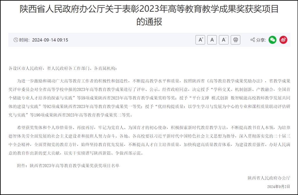 近日,陕西省人民政府发布《陕西省人民政府办公厅关于表彰2023年高等教育教学成果奖获奖项目的通报》(陕政办函〔2024〕104号),买球体育官方网站共3项成果获奖,其中特等奖1项,一等奖1项,二等奖1项。