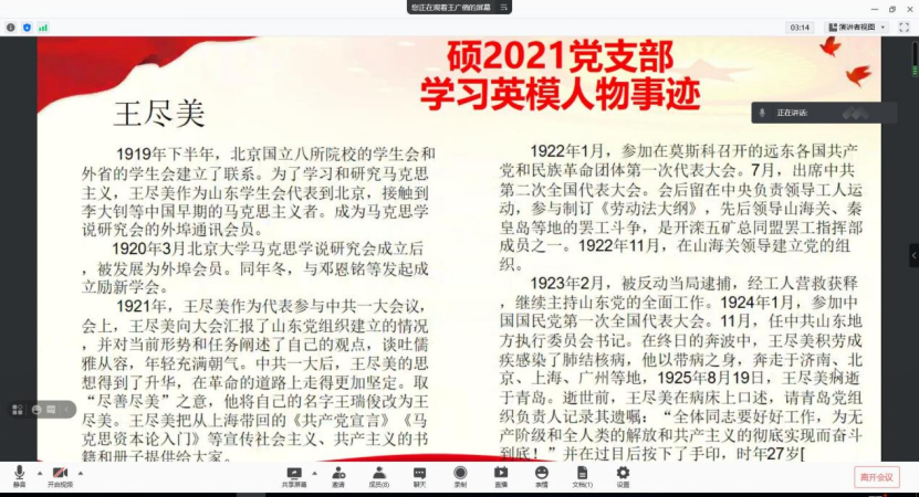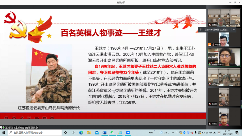 在中国共产党成立100周年之际,为深化党史学习教育,厚植爱国主义情怀,进一步推动红色精神的传承,买球体育官方网站研究生党支部在党委号召下于7月5日以来陆续开展“五个一百”系列学习会议,本次学习教育以学习百名英模人物为主题展开。
