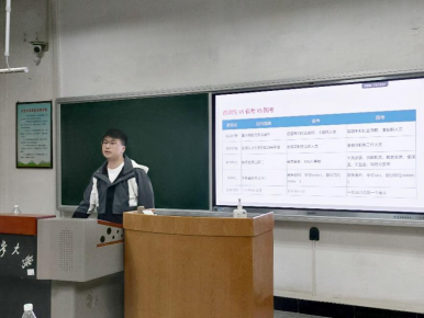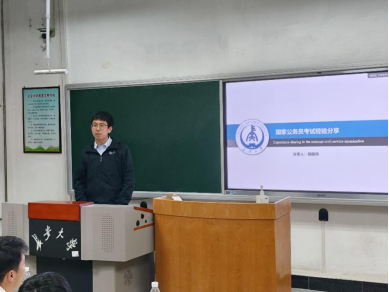 杨振伟则分享了自己国考上岸的心路历程。他详细地介绍了自己的备考周期、时间安排与备考资料,并根据考试题型给出了具体建议。杨振伟通过自身的切身经历向大家说明国考并不可怕,关键在于要做好充分的准备、要有毅力与信心,极大鼓舞了在座学生的信心与勇气。